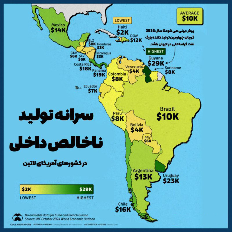 این نمودار سرانه تولید ناخالص در آمریکای لاتین و جنوبی را بر اساس داده های چشم انداز اقتصاد جهانی اکتبر ۲۰۲۴ صندوق بین المللی پول نشان می دهد.