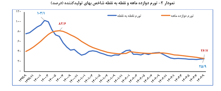 همراستا با کاهش تورم ماهانه، تورم نقطه به نقطه شاخص بهای کالاها و خدمات مصرفی نیز با ثبت تورم 33.8 درصد در آذرماه سال جاری به کمترین سطوح خود در پنجاه و چهار ماه اخیر(از تیر سال 1399) رسید. تورم دوازدهماهه منتهی به آذرماه 1403 نیز در ادامه روند کاهشی خود با 1.0 واحد درصد کاهش نسبت به ماه قبل به 36.3 درصد رسید که بعد از گذشت 50 ماه (از آبان سال 1399) به کمترین میزان خود رسیده است.