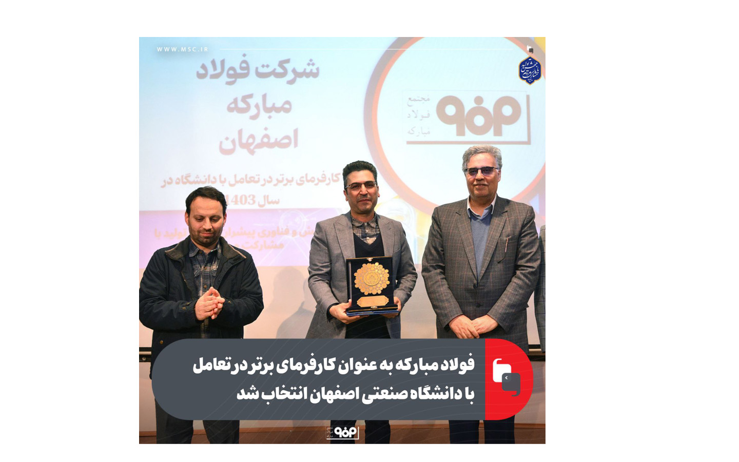 در این آیین از شرکت فولاد مبارکه به عنوان «کارفرمای برتر در تعامل با دانشگاه صنعتی اصفهان در سال ۱۴۰۳» با اهدای لوح و تندیس تقدیر به عمل آمد و شهرام عباسی، مدیر تحقیق و توسعه فولاد مبارکه به نمایندگی از این شرکت این تندیس را دریافت کرد.