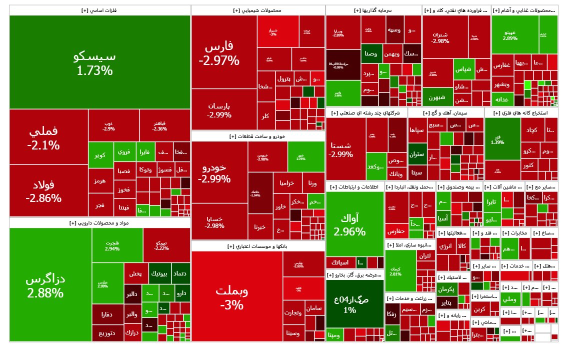 شاخص کل از 134. 910. 2 به 311. 857. 2 واحد رسید و حدود 54۰۰۰ واحد از ارتفاع شاخص کل کاسته شد که این کاهش متأثر از منفی نمادهای فارس، فولاد مبارکه و فملی بود.