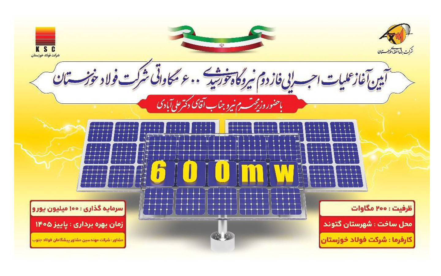 وی با بیان اینکه نخستین فاز این نیروگاه در قالب ۲۰۰ مگاوات در آبانماه سال جاری در شهرستان بهبهان کلنگزنی شد، گفت: پیشبینی میشود که احداث نیروگاههای خورشیدی بتواند بسیاری از مشکلات موجود در صنعت برق استان را برطرف کند. فاز دوم این نیروگاه در استان خوزستان و در شهرستان گتوند به سفارش شرکت فولاد خوزستان و اجرای شرکت مهندسین مشاور پیشگامان فولاد جنوب فردا ۴ بهمنماه ۱۴۰۳ با حضور وزیر نیرو و دیگر مسئولان کشوری و استانی کلنگزنی میشود.