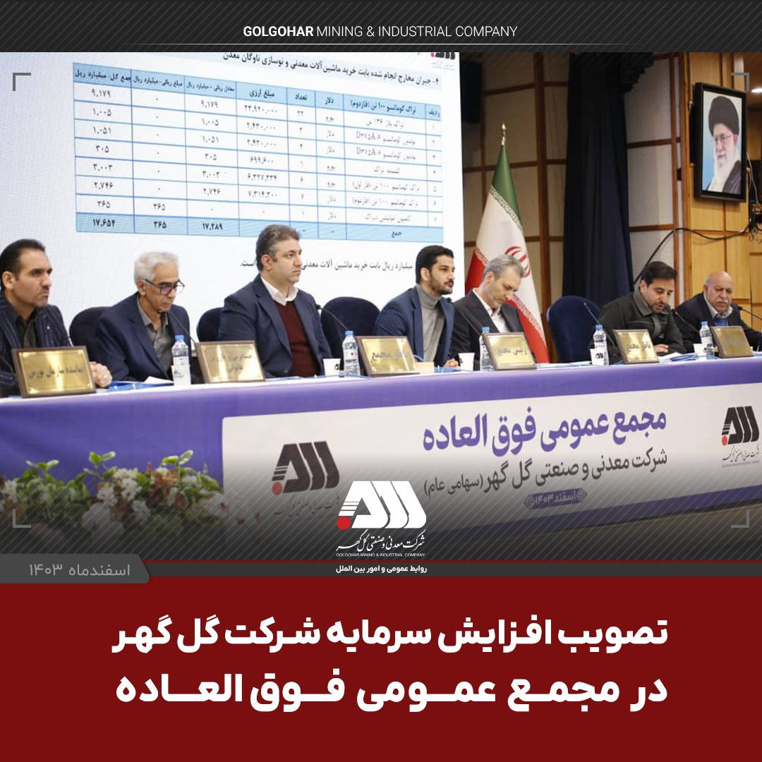گفتنی است در پایان مجمع و با رای سهامداران، افزایش سرمایه گل گهر از ۴۳ هزار میلیارد تومان به ۵۵ هزار و ۵۰۰ میلیارد تومان ( ۲۹۰۰ میلیارد تومان از محل سود انباشته و ۹۶۰۰ میلیارد تومان از محل مطالبات حال شده و آورده نقدی سهامداران) به تصویب رسید.