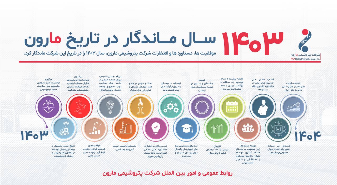 به گزارش روابط عمومی و امور بین الملل شرکت پتروشیمی مارون با همت کارکنان و هدایت همدلانه مدیران این شرکت دفتر سال 1403 را با انبوهی از موفقیت ها و رکورد های ماندگار خاتمه می دهد.