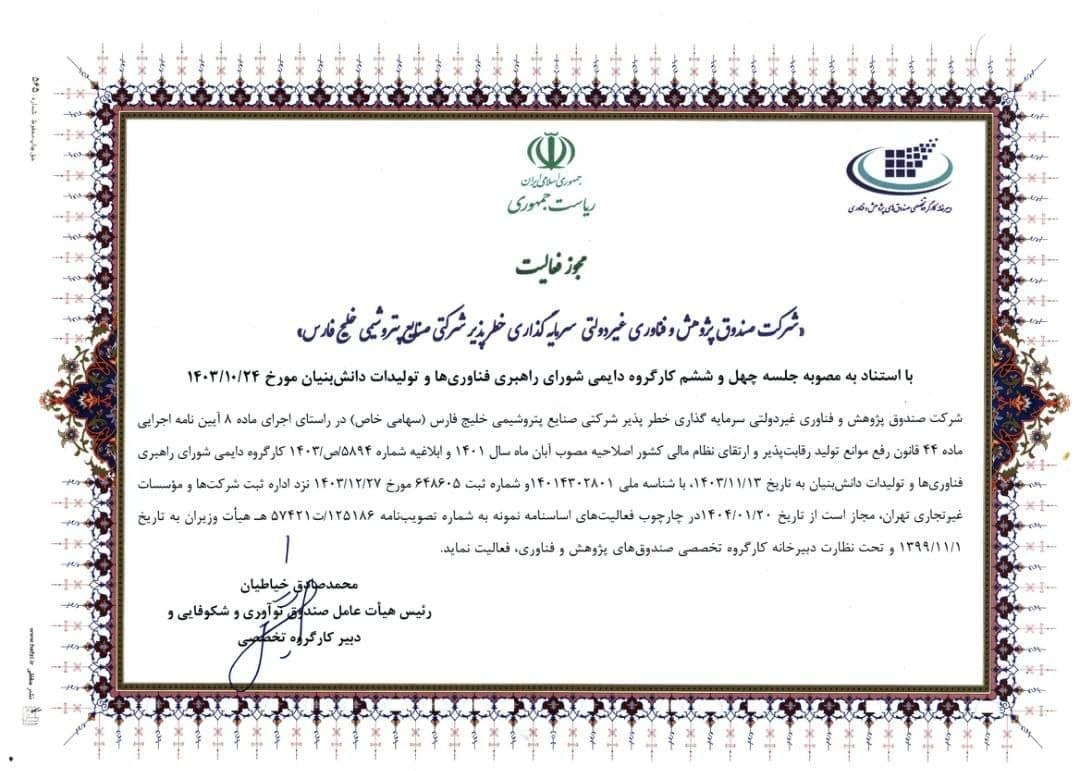 در تاریخ ۲۰ فروردین ماه ۱۴۰۴، مجوز فعالیت صندوق پژوهش و فناوری خطرپذیر شرکت صنایع پتروشیمی خلیج فارس توسط دبیرخانه کارگروه تخصصی صندوقهای پژوهش و فناوری ریاست جمهوری صادر شد. به گزارش روابط عمومی شرکت صنایع پتروشیمی خلیج فارس، این مجوز به استناد مقررات و پس از طی مراحل قانونی لازم، به صندوق اعطا گردید تا زمینه فعالیتهای جدید در حوزه سرمایهگذاری خطرپذیر و مالی حوزه پتروشیمی فراهم شود.