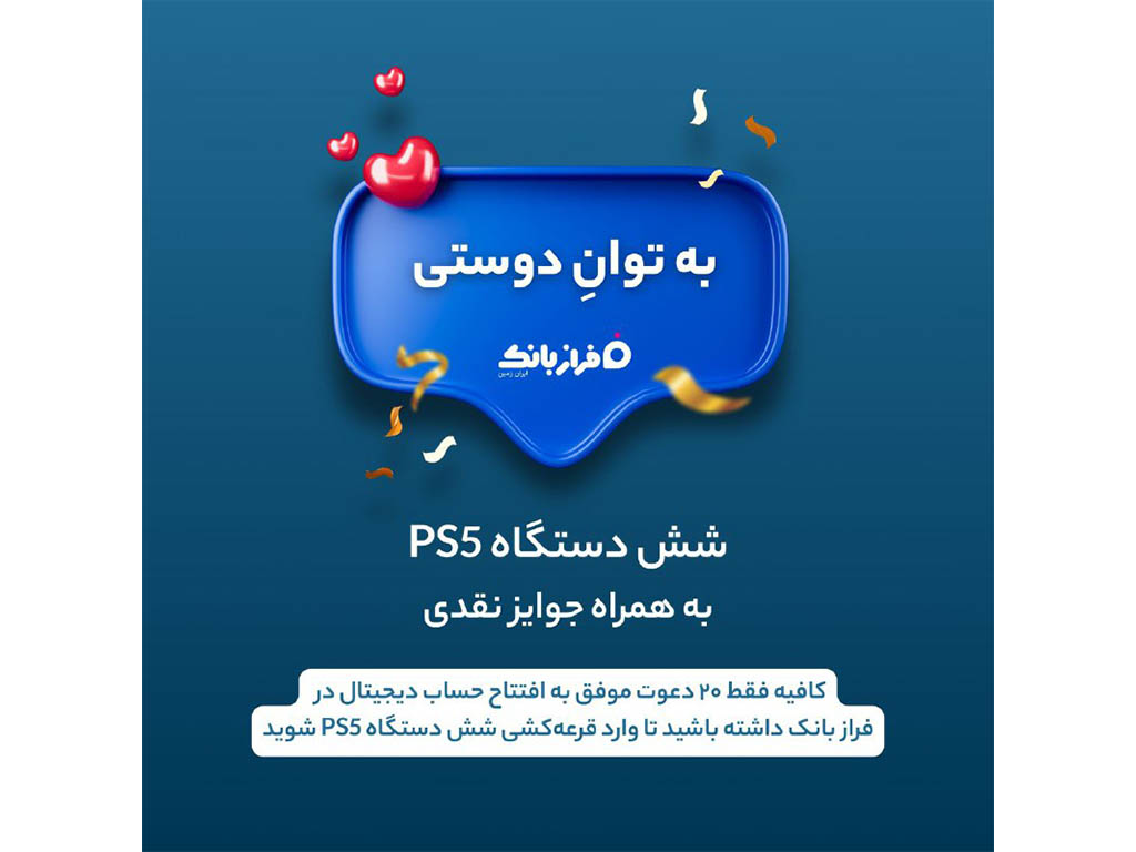اگر ۲۰ نفر دعوت کنید تا حساب دیجیتال فراز بانک افتتاح کنند و کارتشان را فعال نمایند، وارد قرعهکشی ۶ دستگاه PlayStation 5 میشوید!