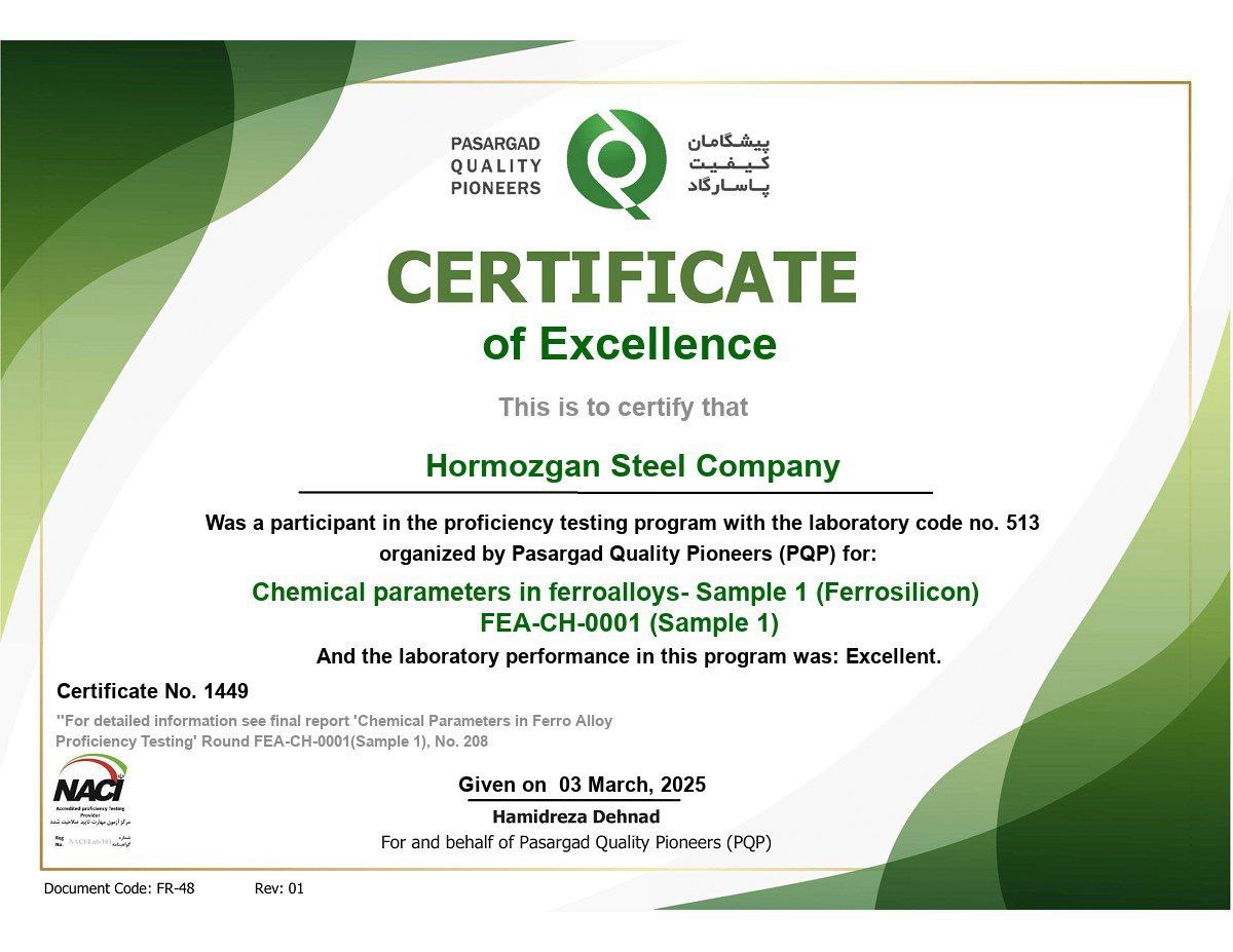 به گزارش روابط عمومی فولاد هرمزگان، صفیه بهمن‌زاده، کارشناس آزمایشگاه‌های آهن‌سازی و مواد معدنی این شرکت، اعلام کرد که آزمون مهارت توسط شرکت پیشگامان کیفیت پاسارگاد، نخستین مرجع تایید صلاحیت‌شده در ایران برای آزمون‌های مهارت بر اساس استاندارد ISO/IEC 17043، برگزار شده است. این استاندارد بین‌المللی زمینه‌ای برای مقایسه عملکرد آزمایشگاه‌ها و اعتبارسنجی توانایی‌های آن‌ها فراهم می‌کند. نتایج این آزمون، اعتبار جهانی بالایی دارد و گواهی بر دقت بالای آزمایشگاه فولاد هرمزگان است.