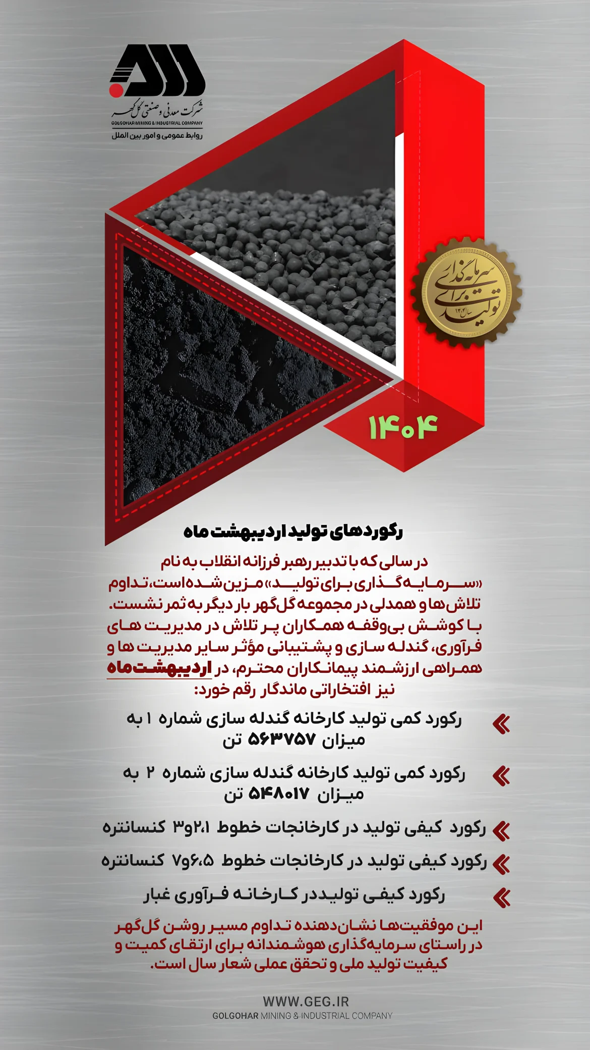 رکوردهای تولیدی اردیبهشت ماه 1404 شرکت معدنی و صنعتی گل گهر توسط 2 خرداد 1404 2 خرداد 1404 149 بورستولید اردیبهشت 1404تولید ماهانهرکورد تولیدرکورد گل گهرروابط عمومی گل گهرسهام کگلشرکت معدنی و صنعتی گل گهرشرکتهای معدنیفولادکگلگل گهرمدیرعامل گل گهرمعدن پست قبلی رکورد جدید آهن اسفنجی در فولاد سفید دشت: ۹۲,۷۶ تن با تحقق ۱۰۲٪ برنامه تولید پست بعدی مشارکت فولاد مبارکه برای تشکیل «کنسرسیوم مهارت» در استان اصفهان همچنین ممکن است دوست داشته باشید تقدیر استاندار و رئیس شورای اقامه نماز استان... 7 بهمن 1404 کسب 2550 میلیارد تومان سود خالص برای شاراک 4 بهمن 1404 نشان عالی و حمایل «حامی مدرسهسازی ایران» بر... 18 دی 1404 رونمایی از سبد سرمایهگذاری خطرپذیر خلیج فارس 18 دی 1404 جهش تولید فولاد سبا؛ تثبیت جایگاه دوم کلاف... 18 دی 1404 تضمین تولید پایدار فولاد اکسین با لجستیک هوشمند 18 دی 1404 سرمایهگذاری استراتژیک بیمه سامان بر نخبگان هوش مصنوعی... 18 دی 1404 ثبت رکورد تاریخی تولید فصلی در ایرانذوب؛ جهش... 18 دی 1404 عبور صندوق اوج از شاخص بورس با ثبت... 18 دی 1404 تزریق ۳۰ هزار میلیارد ریال به معادن طلا... 18 دی 1404 پیام بگذارید لغو پاسخ نام ، ایمیل و وب سایت خود را برای بار دیگر که اظهار نظر می کنم در این مرورگر ذخیره کنید.