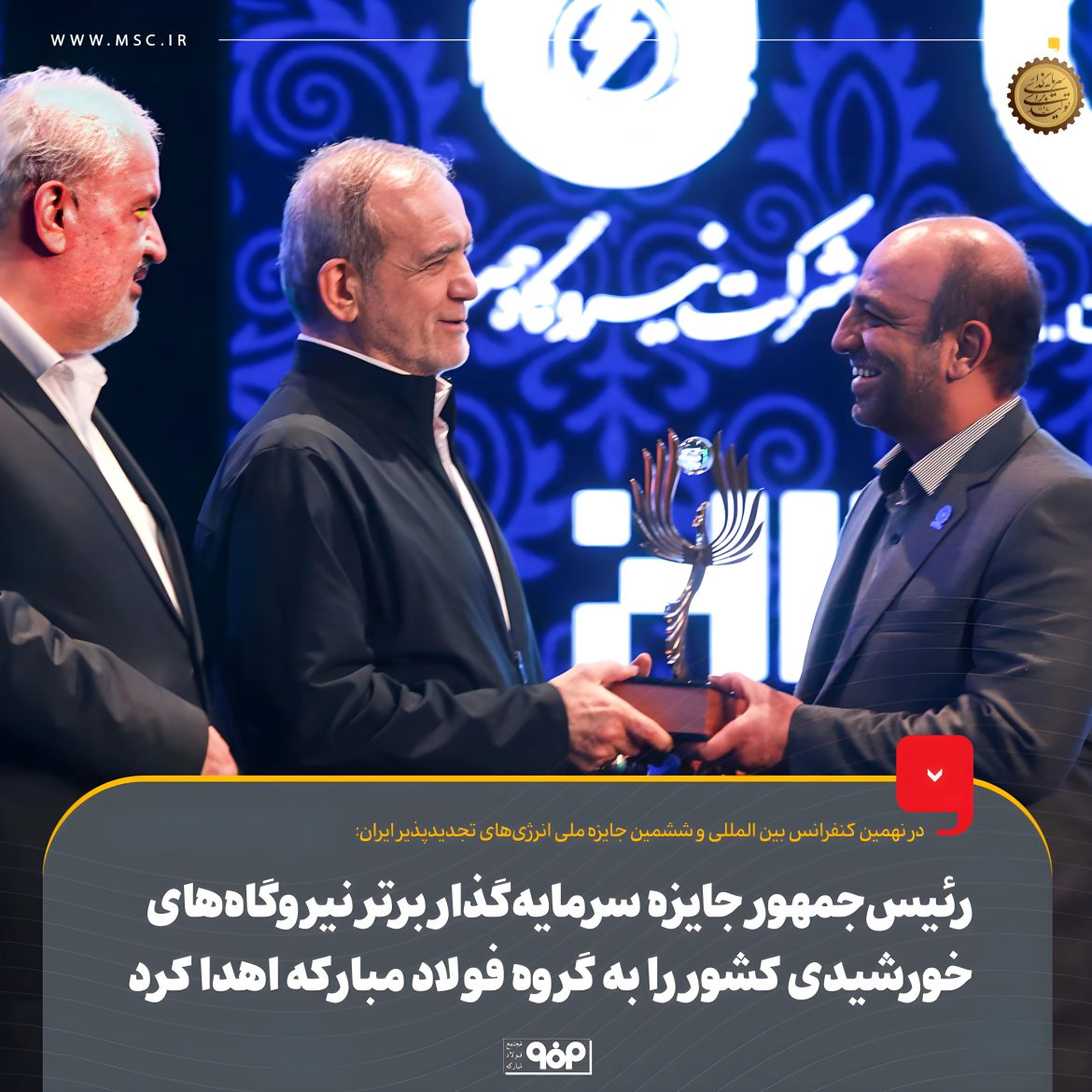 در نهمین همایش ملی انرژیهای تجدیدپذیر که در برج میلاد تهران برگزار شد، گروه فولاد مبارکه موفق شد جایزه «سرمایهگذار برتر سال ۱۴۰۳» در حوزه نیروگاههای خورشیدی را از آن خود کند. این جایزه ویژه در مراسم با حضور رئیسجمهور، مسعود پزشکیان و عباس علیآبادی وزیر نیرو، به نماینده شرکت صنایع نیرو و انرژی پاک فولاد (صناپ) بهعنوان کارفرمای پروژه خورشیدی آفتاب شرق اعطا شد.