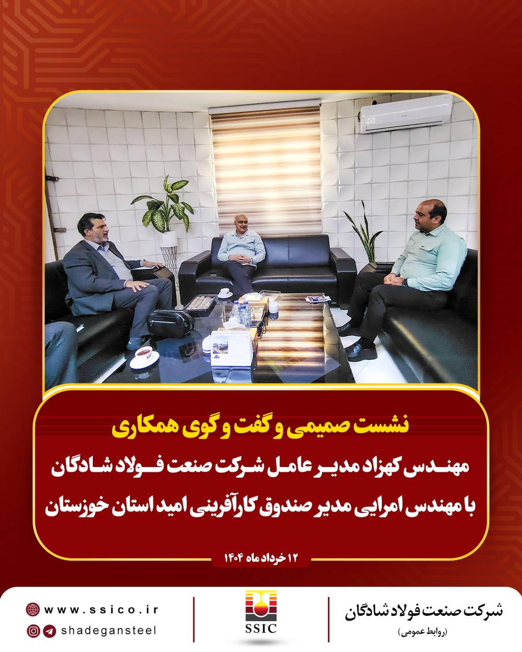 در گامی مهم و در راستای تحقق مسئولیتهای اجتماعی و توسعه پایدار منطقهای، شرکت صنعت فولاد شادگان و صندوق کارآفرینی امید استان خوزستان، طی نشستی صمیمانه و سازنده، سنگ بنای همکاری مشترکی را برای حمایت از نوآوری و اشتغالزایی بنا نهادند.