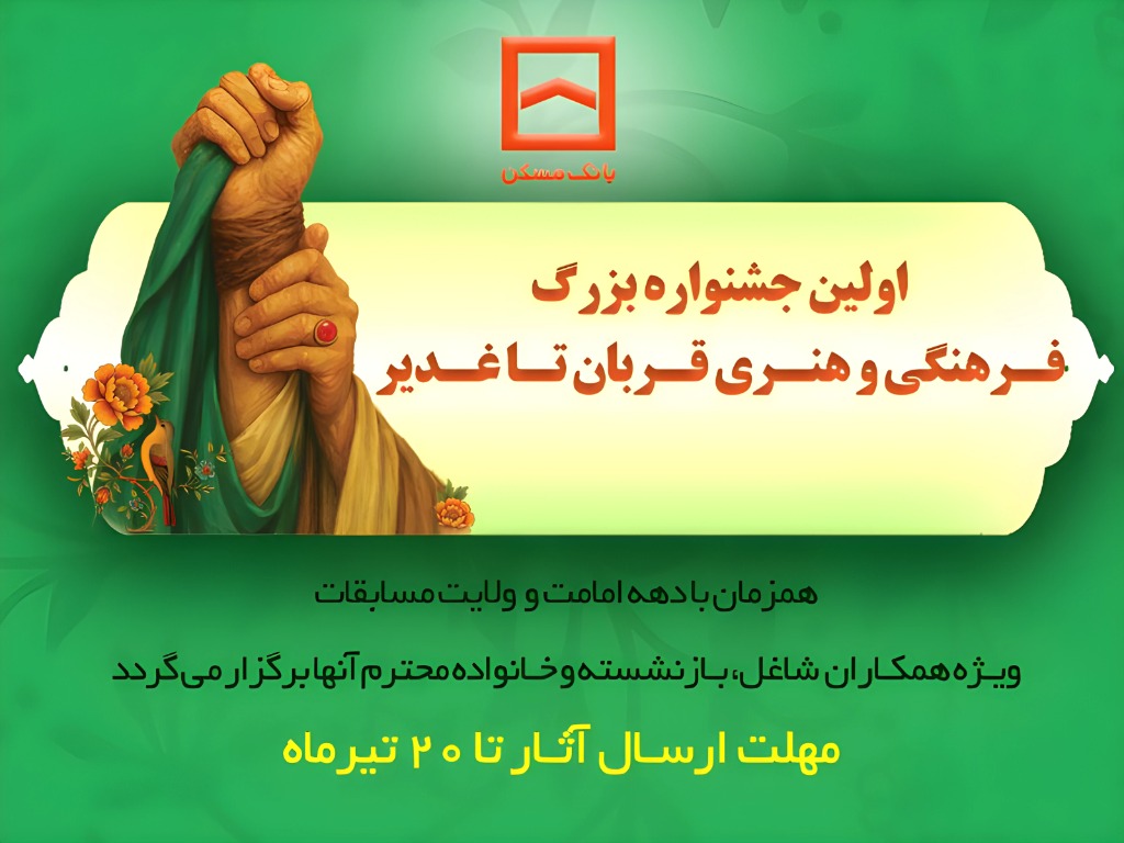 اداره کل روابط عمومی بانک مسکن، به مناسبت دهه امامت و ولایت، اولین جشنواره فرهنگی و هنری «قربان تا غدیر» را با هدف ترویج فرهنگ غدیر و بزرگداشت ارزشهای اسلامی برای کارکنان و خانوادههای آنان برگزار میکند.