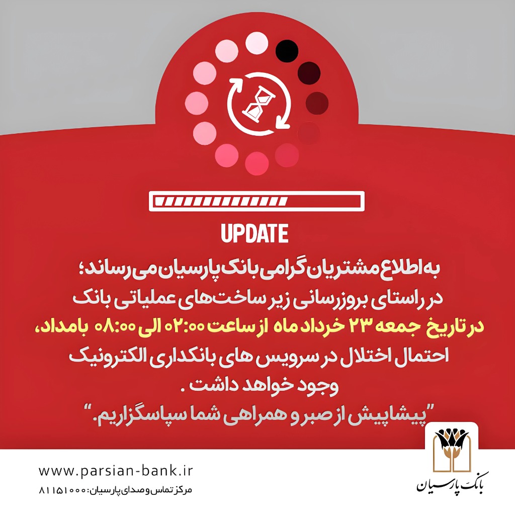 بانک پارسیان با انتشار اطلاعیه‌ای رسمی، مشتریان خود را از یک به‌روزرسانی مهم در سیستم‌های خود مطلع کرد. این بانک اعلام نمود که در راستای بهبود و ارتقاء زیرساخت‌های عملیاتی، سرویس‌های بانکداری الکترونیک با اختلال موقت مواجه خواهند شد. این اقدام بخشی از برنامه منظم بانک برای ارائه خدمات باکیفیت‌تر و امن‌تر به تمام کاربران و مشتریان است.
