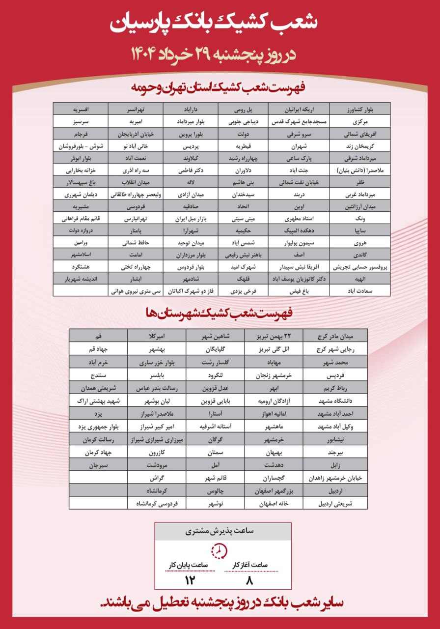 بانک پارسیان لیست شعب کشیک فعال در روز پنجشنبه ۲۹ خرداد ۱۴۰۴ را به اطلاع مشتریان رساند. این شعب آماده ارائه خدمات بانکی در ساعات اعلام شده خواهند بود.