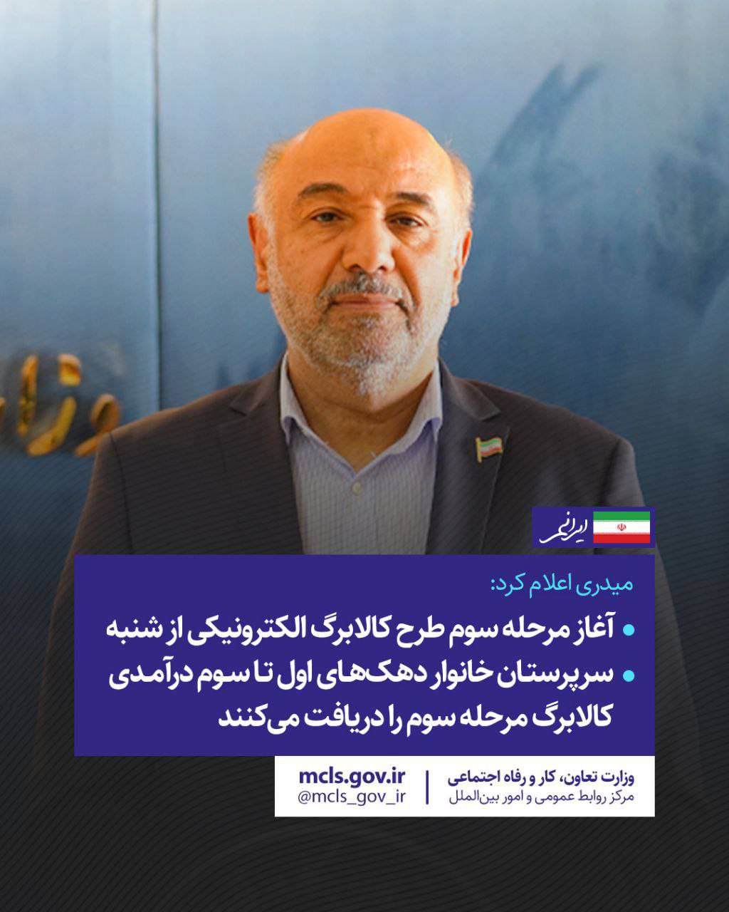 احمد میدری، وزیر تعاون، کار و رفاه اجتماعی، از آغاز سومین مرحله طرح کالابرگ الکترونیکی از روز شنبه، 7 تیر ماه سال جاری خبر داد. وی اعلام کرد که اعتبار این مرحله به حساب سرپرستان خانوار که در دهکهای اول تا سوم درآمدی قرار دارند، واریز میشود. این اقدام با هدف حمایت مستقیم از معیشت خانوارها و تقویت سبد غذایی آنها صورت میگیرد.