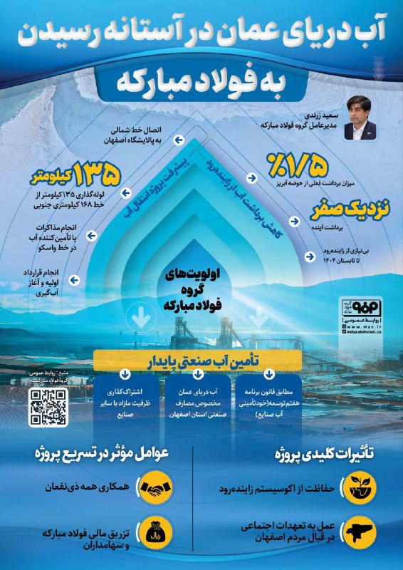 گروه فولاد مبارکه اعلام کرد پروژه عظیم انتقال آب از دریای عمان به این شرکت، مراحل پایانی خود را با موفقیت طی میکند. به گفته سعید زرندی، مدیرعامل این گروه، این طرح یکی از اولویتهای اصلی شرکت برای دستیابی به تأمین آب صنعتی پایدار و عمل به تعهدات زیستمحیطی است. با نزدیک شدن به بهرهبرداری از این خط انتقال، وابستگی حیاتی این غول صنعتی به منابع آبی زایندهرود به طور کامل حذف خواهد شد.