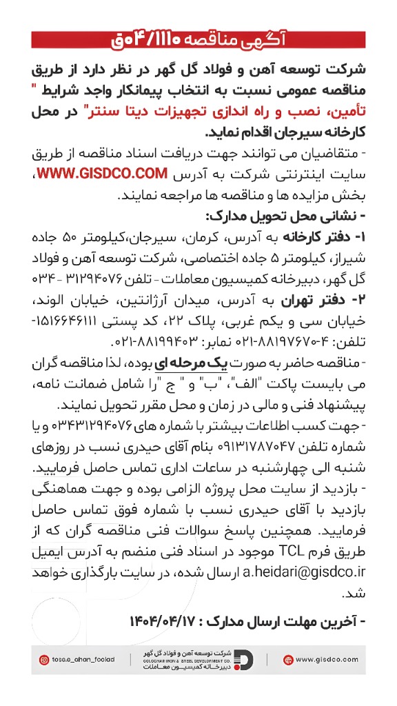 شرکت توسعه آهن و فولاد گل گهر، آخرین مهلت برای ارسال و تحویل مدارک مناقصه را روز 1404/04/17 اعلام کرده است. پیشنهادهای واصله پس از این تاریخ مورد پذیرش قرار نخواهند گرفت.