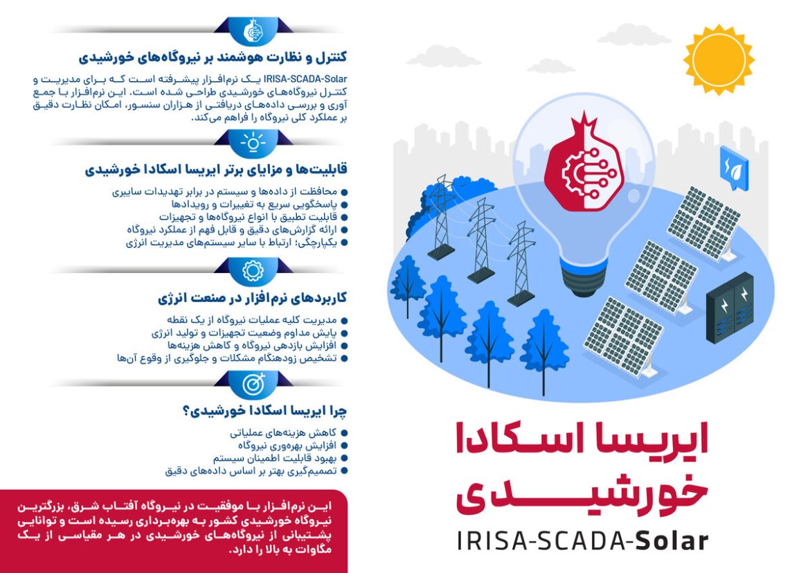 یک نرمافزار پیشرفته با نام IRISA-SCADA-Solar به صورت اختصاصی برای مدیریت و کنترل یکپارچه نیروگاههای خورشیدی طراحی شده است. این سامانه با استفاده از فناوریهای نوین، فرآیند نظارت بر عملکرد کلی نیروگاه را متحول میسازد. زیرساخت این نرمافزار بر جمعآوری و تحلیل دادههای دریافتی از هزاران سنسور نصبشده در نیروگاه استوار است و نظارتی دقیق را فراهم میکند.