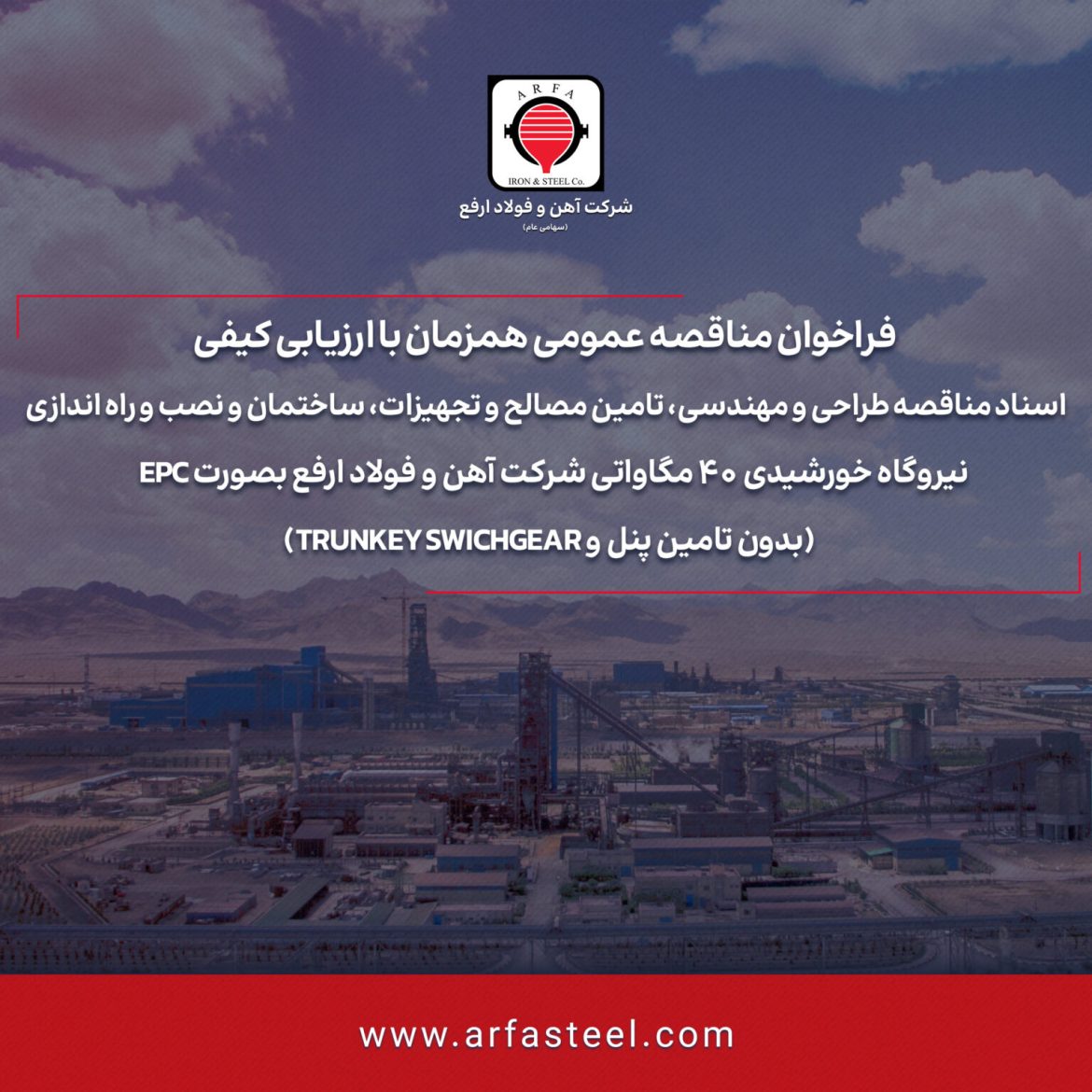شرکت آهن و فولاد ارفع در نظر دارد پروژه طراحی، مهندسی، تامین تجهیزات، ساخت و راهاندازی یک نیروگاه خورشیدی 40 مگاواتی را واگذار کند. این پروژه بزرگ از طریق یک مناقصه عمومی دو مرحلهای همراه با ارزیابی کیفی انجام خواهد شد. این فراخوان از تمام پیمانکاران دارای صلاحیت دعوت میکند تا در این رقابت استراتژیک شرکت نمایند. اجرای این پروژه به صورت EPC خواهد بود، اما تامین پنلهای خورشیدی و ترنکی سوئیچگیر از محدوده قرارداد خارج است.