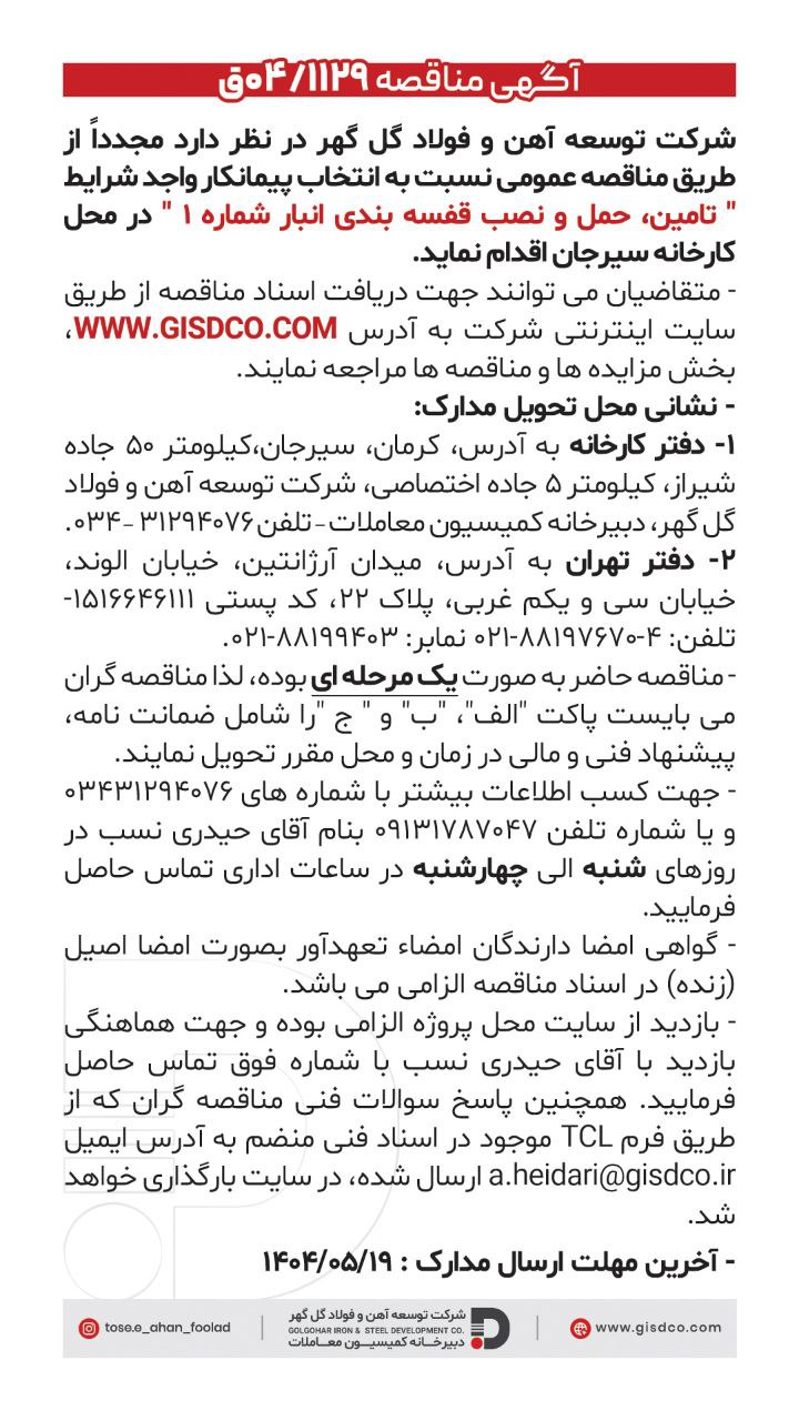 شرکت توسعه آهن و فولاد گل گهر با انتشار آگهی مناقصه عمومی به شماره 04/1139ق، مجدداً فراخوان همکاری داد. این شرکت در نظر دارد از طریق این مناقصه، پیمانکار واجد شرایطی را برای پروژه خود انتخاب نماید. موضوع این مناقصه، “تأمین، حمل و نصب قفسه بندی انبار شماره 1” در محل کارخانه سیرجان تعریف شده است. این مناقصه به صورت یک مرحلهای برگزار خواهد شد.