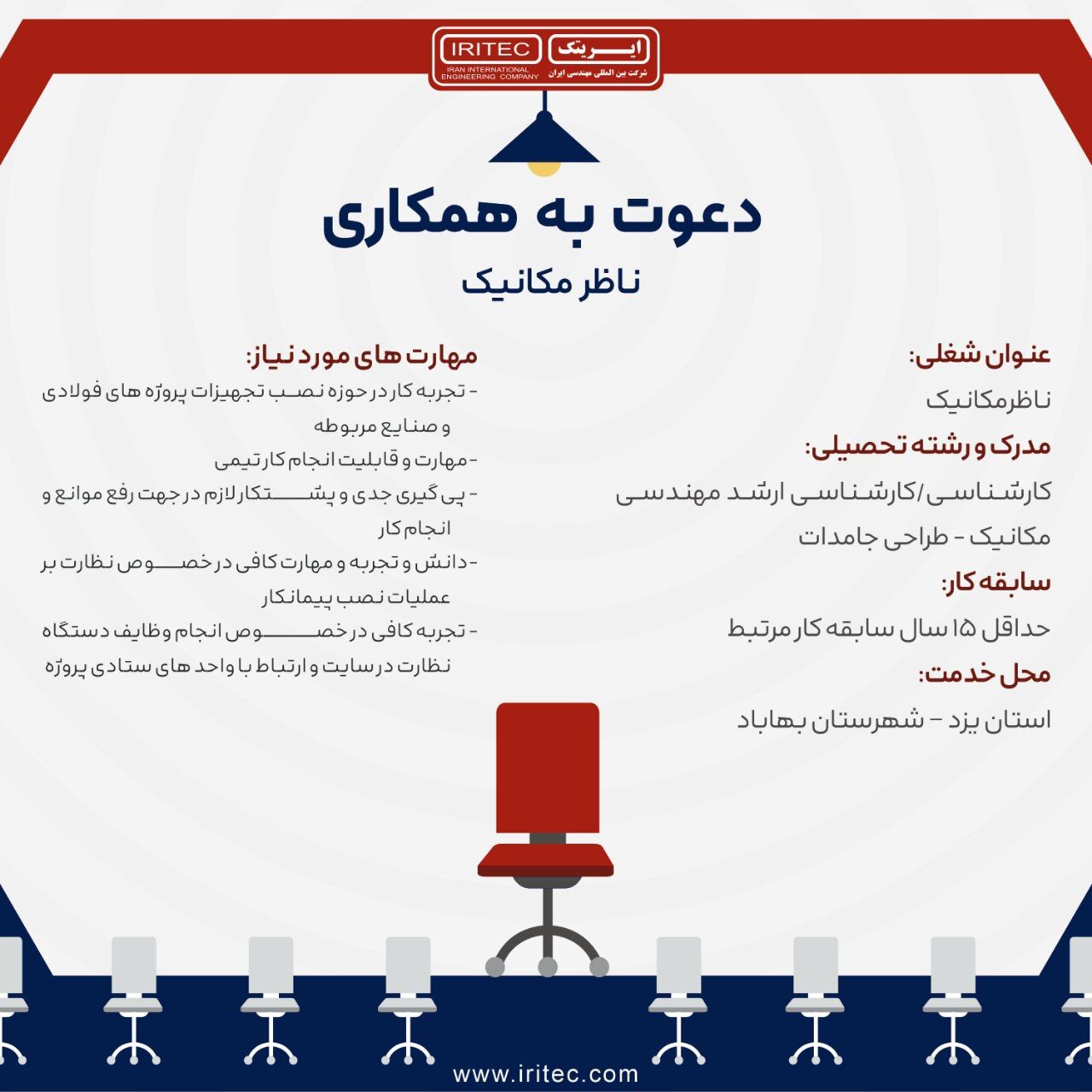 شرکت بینالمللی مهندسی ایران (ایریتک) در راستای تکمیل کادر فنی و تخصصی خود، آگهی دعوت به همکاری برای جایگاه شغلی «ناظر مکانیک» منتشر کرده است. این فرصت شغلی برای پیشبرد پروژههای صنعتی این شرکت، با تمرکز ویژه بر صنایع فولادی، ایجاد شده است. ایریتک به دنبال جذب نیروهای باتجربه از دانشگاههای معتبر برای تقویت تیم خود است.