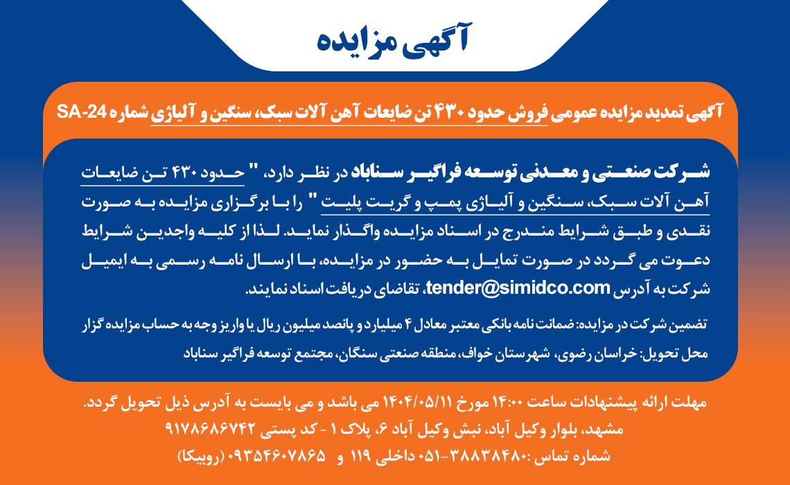 شرکت صنعتی و معدنی توسعه فراگیر سناباد اعلام کرد که قصد فروش حدود 430 تن ضایعات فلزی را از طریق برگزاری یک مزایده عمومی دارد. این محموله شامل آهنآلات سبک، سنگین و همچنین ضایعات آلیاژی خاص مانند پمپ و گریت پلیت است. این مزایده با شماره 24-SA و به صورت پرداخت نقدی انجام خواهد شد و فرصتی برای فعالان صنعت بازیافت و مواد اولیه فراهم میکند.
