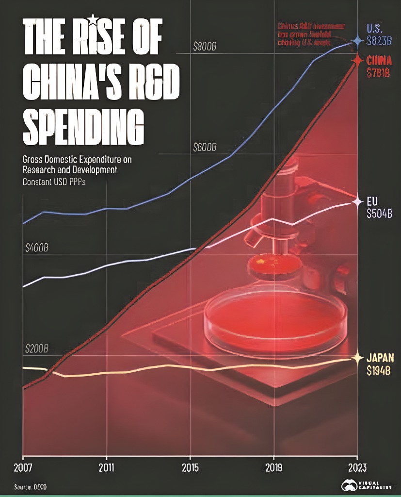 بین سالهای 2007 تا 2023، هزینهکرد ناخالص داخلی چین در تحقیق و توسعه (GERD) تقریباً 6 برابر شد. این رقم از 136 میلیارد دلار به 781 میلیارد دلار افزایش یافت که اختلافی اندک با 823 میلیارد دلار هزینه شده توسط ایالات متحده در سال 2023 دارد. این جهش سریع و قابل توجه، به وضوح نشاندهنده اولویتبندی استراتژیک نوآوری از سوی دولت چین به عنوان یک محرک کلیدی برای رشد اقتصادی است. همچنین خودکفایی فناورانه و افزایش رقابتپذیری جهانی از دیگر اهداف این سرمایهگذاری محسوب میشود.