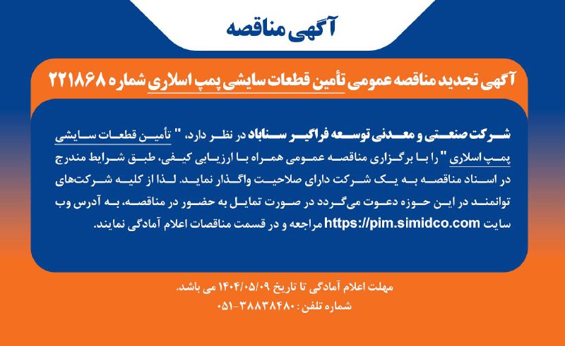 تمام شرکتهای توانمند و متخصص در حوزه تأمین قطعات صنعتی دعوت شدهاند تا آمادگی خود را برای حضور در این مناقصه اعلام کنند. متقاضیان باید به وبسایت رسمی شرکت به آدرس https://pim.simidco.com مراجعه نمایند. پس از ورود به سایت، لازم است به قسمت “مناقصات” رفته و تمایل خود را برای مشارکت ثبت کنند. مهلت نهایی برای انجام این فرایند و اعلام آمادگی، روز 9 مرداد ماه سال 1404 است. برای اطلاعات بیشتر، شماره تلفن 38838480-051 نیز در دسترس است.