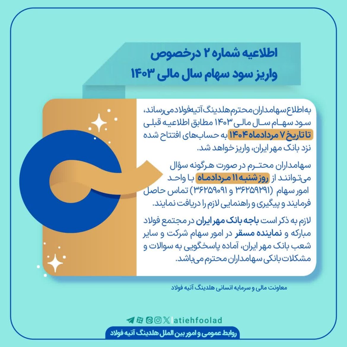 این شرکت برای پاسخگویی به هرگونه سوال یا ابهام احتمالی، کانالهای ارتباطی مشخصی را تعریف کرده است. سهامداران محترم میتوانند از روز شنبه، 11 مردادماه 1404، با واحد امور سهام هلدینگ آتیهفولاد تماس حاصل فرمایند. شمارههای تلفن 36259291 و 36259091 برای ارائه پیگیری و راهنماییهای لازم به سهامداران اختصاص یافته است.