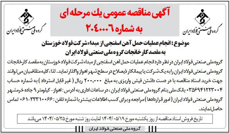photo 2025 08 12 09 16 01 - گروه ملی صنعتی فولاد ایران با انتشار 2 آگهی، مناقصات بزرگ حمل و نقل برگزار می‌کند