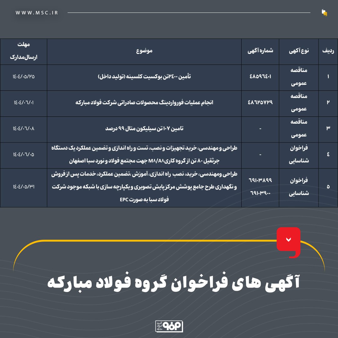 گروه فولاد مبارکه برای تقویت زیرساختهای خود فراخوانهای متنوعی را منتشر کرده است. در این راستا، مناقصهای برای انجام عملیات فورواردینگ محصولات صادراتی شرکت فولاد مبارکه برگزار میکند. همچنین فراخوانی جهت خرید، نصب و راهاندازی یک دستگاه UPS ماژولار با ظرفیت 30 کیلووات مربوط به واحد اکسیژن شرکت فولاد و نورد سبا اصفهان اعلام شده است.