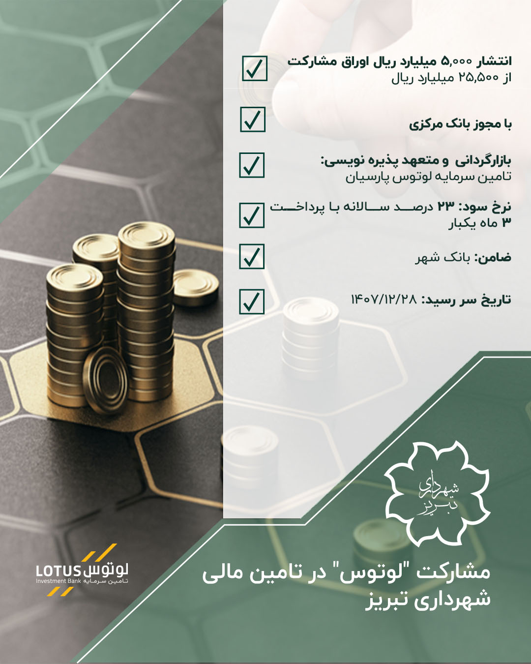 تأمین سرمایه لوتوس پارسیان نقش کلیدی در تأمین مالی 25,500 میلیارد ریالی شهرداری تبریز ایفا کرد. این شرکت با قبول تعهد پذیرهنویسی و همچنین بازارگردانی مبلغ 5,000 میلیارد ریال از این اوراق، سهمی نزدیک به 20 درصد از کل این فرآیند تأمین مالی را به خود اختصاص داد. این مشارکت فعال، تعهد لوتوس پارسیان به حمایت از طرحهای زیربنایی شهری را به نمایش میگذارد و جایگاه آن را در بازار سرمایه کشور تقویت میکند.