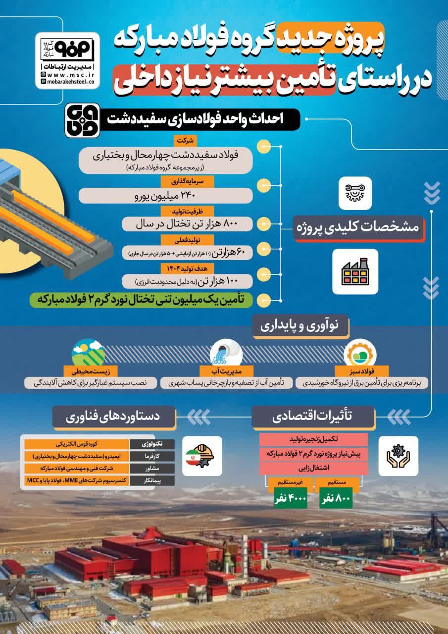 گروه فولاد مبارکه در یک اقدام استراتژیک، پروژه احداث واحد فولادسازی شرکت سفیددشت چهارمحال و بختیاری را آغاز کرد. برای این طرح عظیم، سرمایهگذاری معادل ۲۴۰ میلیون یورو در نظر گرفته شده است. این واحد جدید ظرفیت اسمی تولید ۸۰۰ هزار تن تختال فولادی در سال را خواهد داشت. این اقدام در راستای تأمین پایدار نیازهای داخلی و تکمیل زنجیره تولید گروه انجام میشود.