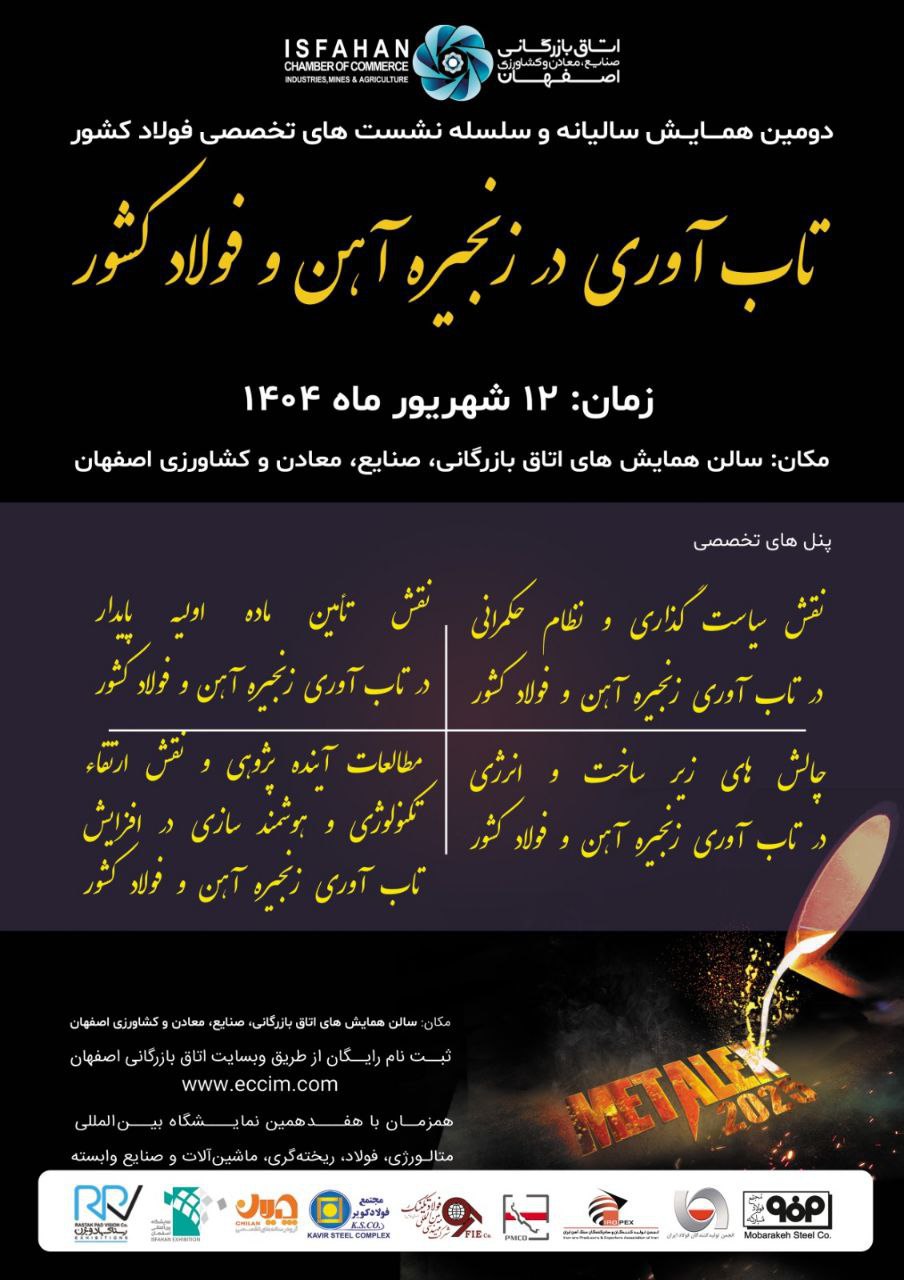 اتاق بازرگانی، صنایع، معادن و کشاورزی اصفهان در روزهای 12 و 13 شهریورماه 1404، میزبان دومین همایش سالیانه فولاد کشور خواهد بود. این رویداد مهم صنعتی تحت عنوان محوری «تابآوری در زنجیره آهن و فولاد کشور» برگزار میشود. هدف اصلی این همایش، تحلیل چالشها و فرصتهای پیش روی یکی از استراتژیکترین صنایع ایران است.