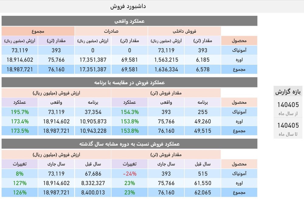 فروش اوره شرکت در مردادماه به 75 هزار و 766 تن رسید که 53 درصد بالاتر از برنامه تعیینشده بود. از این میزان، بیش از 69 هزار تن به بازارهای جهانی صادر شد که یک رکورد بیسابقه در 4 سال اخیر شرکت به شمار میرود. این موفقیت در شرایطی به دست آمده که محدودیتهای حمل دریایی و پیچیدگیهای مالی ناشی از تحریمها، سرعت صادرات صنعت را کاهش داده است.