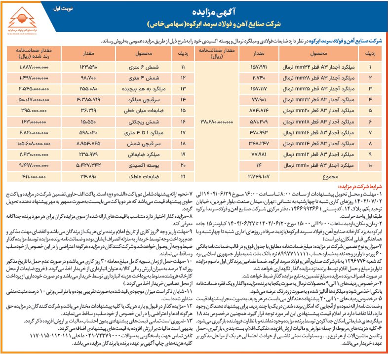 شرکت صنایع آهن و فولاد سرمد ابرکوه (سهامی خاص) در نظر دارد طی یک مزایده عمومی، سبد متنوعی از محصولات خود را به فروش برساند. این مزایده شامل انواع ضایعات فولادی، میلگردهای نرمال آجدار در سایزهای مختلف و همچنین پوسته اکسیدی است. این اقدام فرصت مناسبی را برای خریداران و فعالان صنایع مرتبط جهت تأمین مواد اولیه مورد نیاز فراهم میآورد.