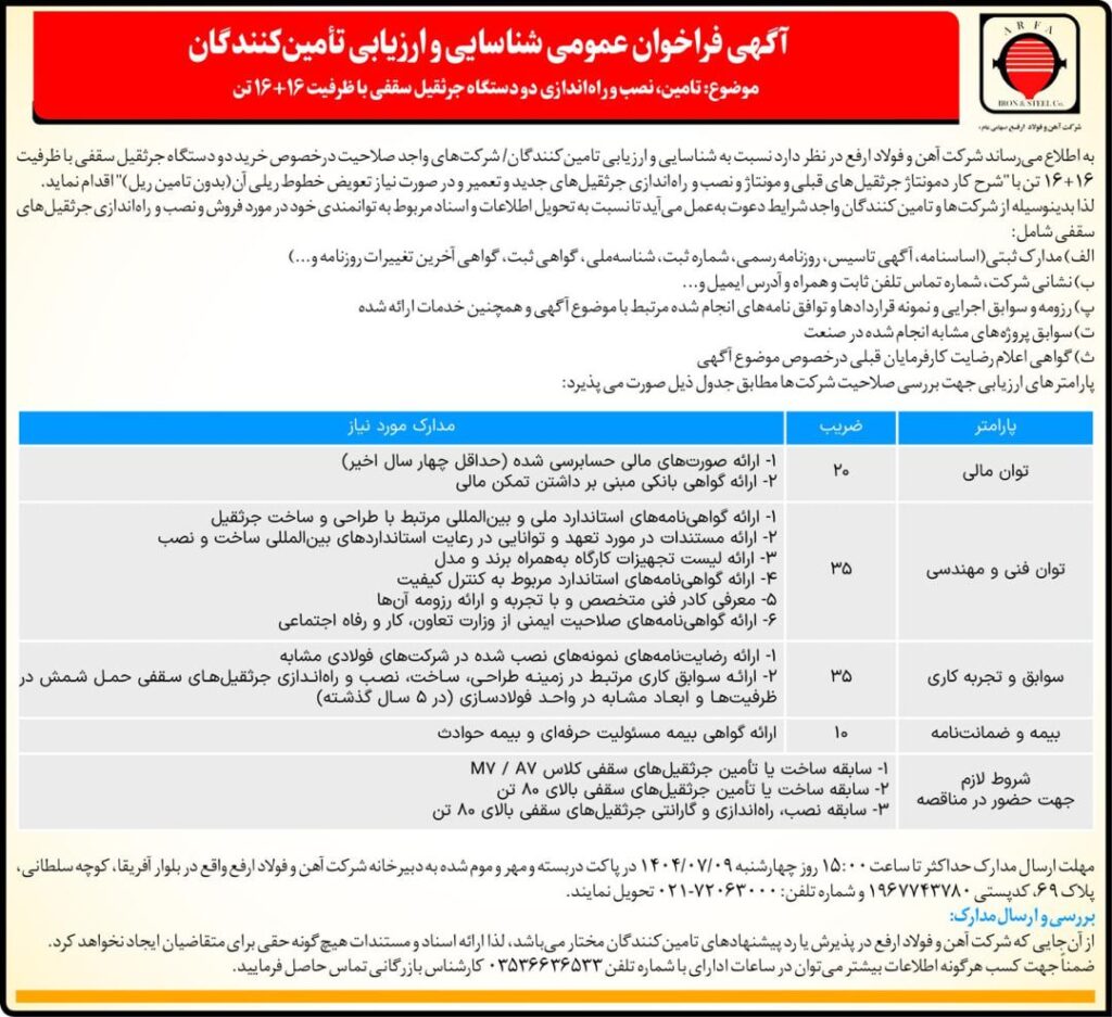 شرکت آهن و فولاد ارفع به منظور نوسازی و بهینهسازی تجهیزات خود، یک فراخوان عمومی برای شناسایی و ارزیابی پیمانکاران توانمند منتشر کرده است. موضوع این فراخوان، تأمین، نصب و راهاندازی دو دستگاه جرثقیل سقفی با ظرفیتهای بالا است. این پروژه شامل دمونتاژ جرثقیلهای قبلی، مونتاژ، نصب و راهاندازی تجهیزات جدید و همچنین تعمیر و راهاندازی جرثقیلهای سقفی با ظرفیت 160 تن و 16 تن در واحد فولادسازی شرکت است.