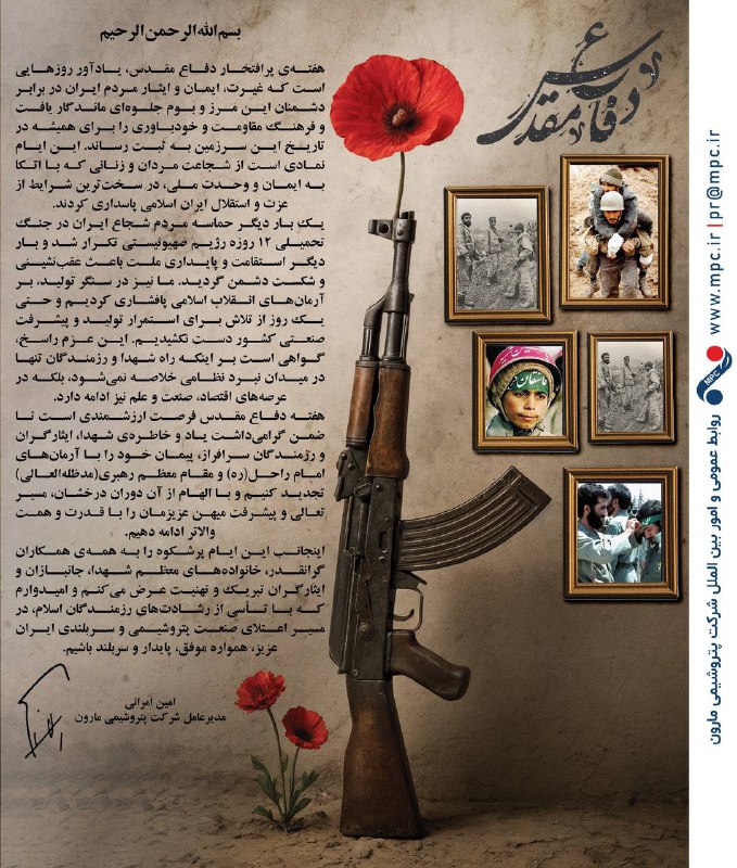 امین امرانی، مدیرعامل شرکت پتروشیمی مارون، در پیامی به مناسبت هفته دفاع مقدس، این ایام را یادآور تجلی غیرت و ایمان ملت ایران دانست. او با تأکید بر اینکه راه شهدا در عرصه‌های اقتصاد، صنعت و علم ادامه دارد، اعلام کرد این شرکت در سنگر تولید به آرمان‌های انقلاب اسلامی پایبند است. وی ضمن تجدید پیمان با آرمان‌های امام راحل (ره) و رهبری، بر ادامه مسیر تعالی و پیشرفت ایران با قدرت و همت تأکید کرد.