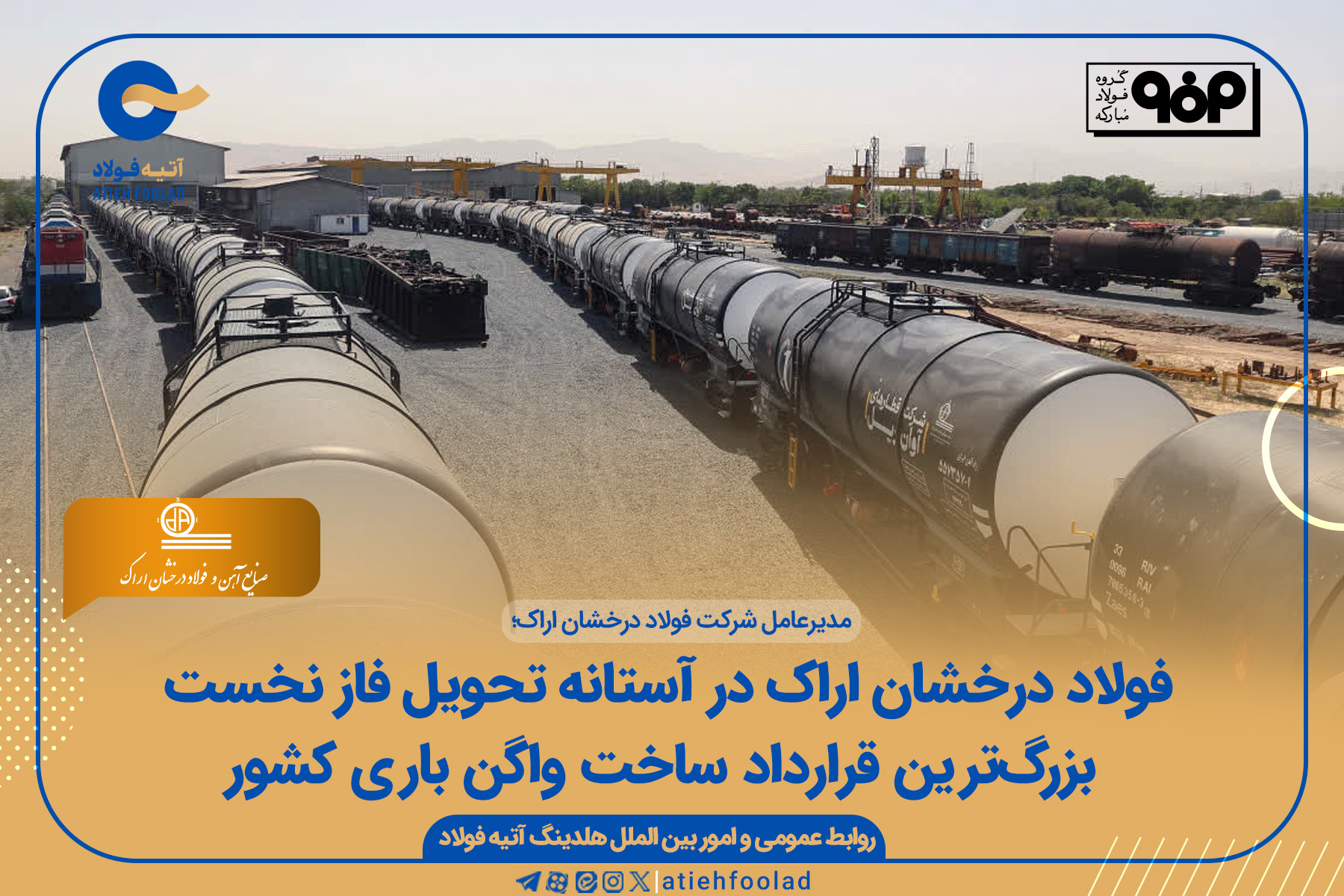 شرکت آهن و فولاد درخشان اراک در آستانه تکمیل فاز نخست بزرگترین قرارداد ساخت واگن باری کشور قرار دارد. این پروژه شامل ساخت 600 دستگاه واگن مخزندار است که فاز اول آن با 300 دستگاه تا پایان آذر 1404 به اتمام میرسد. تاکنون 185 دستگاه از این فاز تکمیل و 160 دستگاه تحویل داده شده است. این پروژه کاملاً بومی، ضمن ایجاد بیش از 800 فرصت شغلی، نقش مهمی در تقویت زیرساخت حملونقل ریلی و پشتیبانی از صادرات فرآوردههای نفتی ایفا میکند.
