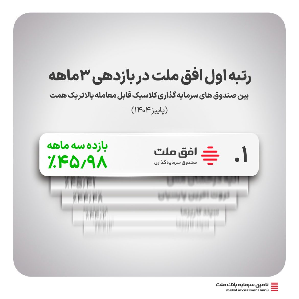 صندوق سرمایهگذاری قابل معامله (ETF) «افق ملت»، تحت مدیریت شرکت تأمین سرمایه بانک ملت، موفق شد در پایان فصل پاییز سال ۱۴۰۴، بالاترین نرخ بازدهی را در میان صندوقهای سهامی بزرگمقیاس کشور به نام خود ثبت کند. این صندوق در رقابت با صندوقهای دارای دارایی تحت مدیریت (AUM) بیش از ۱۰۰۰ میلیارد تومان، در تمامی بازههای زمانی کوتاهمدت و میانمدت پیشتاز بوده و کارایی استراتژیهای مدیریت دارایی خود را اثبات کرده است.